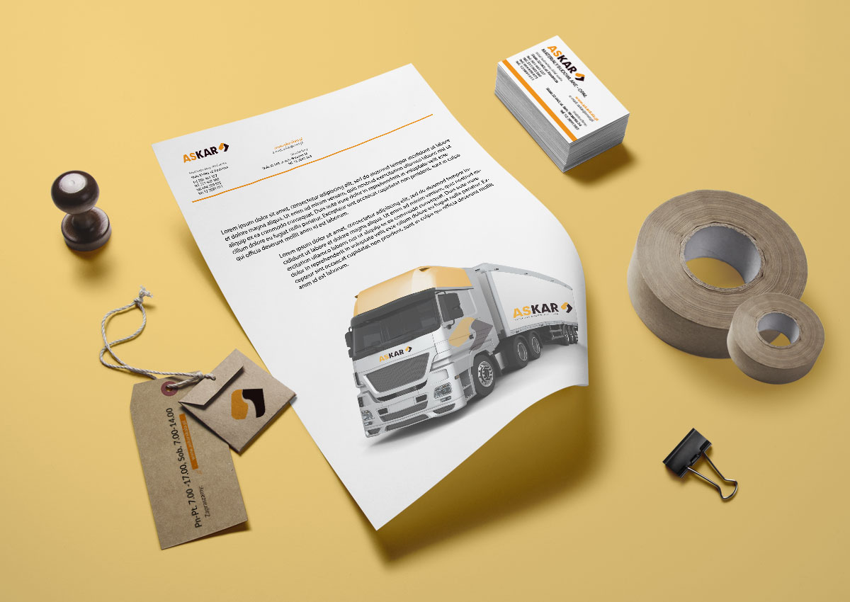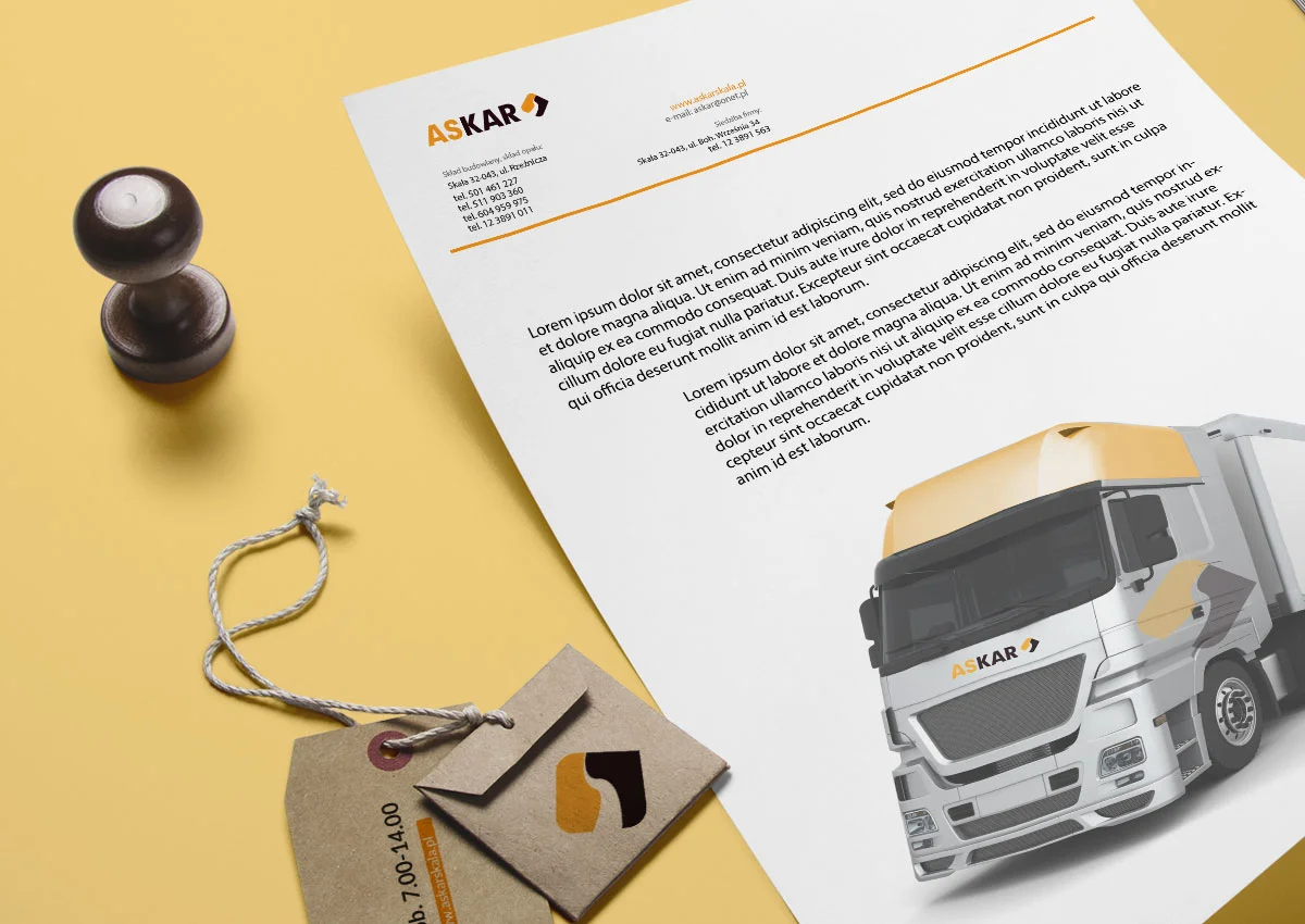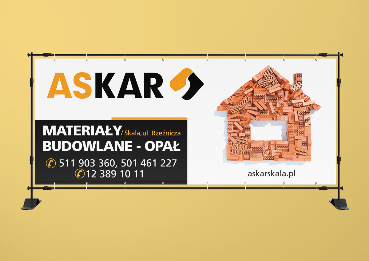 Askar Opracowanie znaku – LOGO, oklejanie pojazdów firmowych, strona www. Tablice i banery reklamowe. Wydruki dla potrzeb firmy Askar.