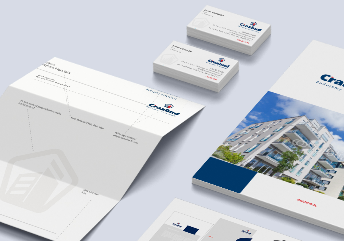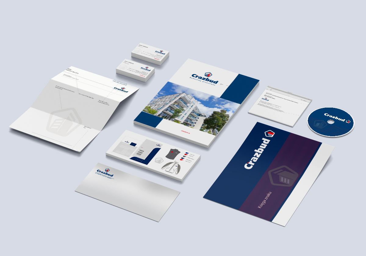 Crazbud Pełna księga znaku podzielona na 4 firmy i spółki. Projekty graficzne pojazdów, wizytówek, reklamy przestrzennej.